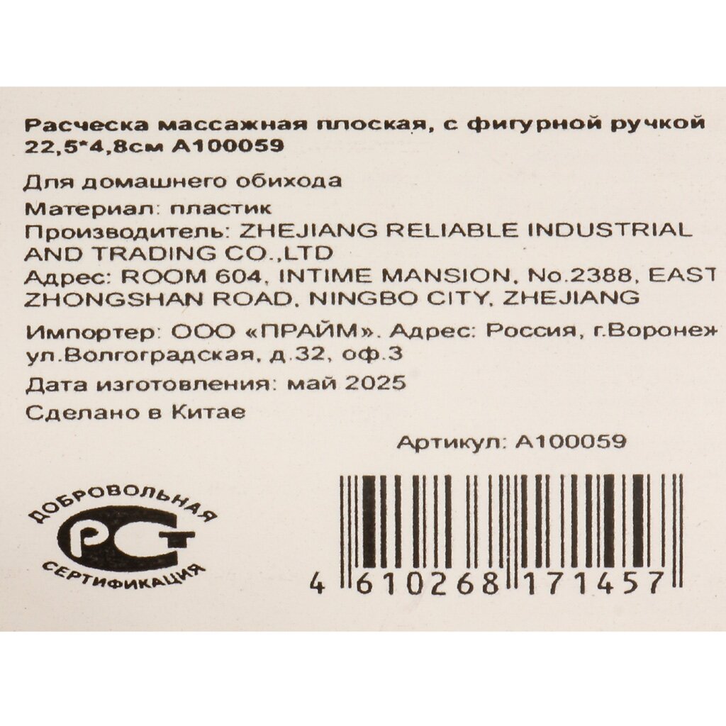 Расческа массажная, 22.5х4.8 см, плоская, с фигурной ручкой, A100058