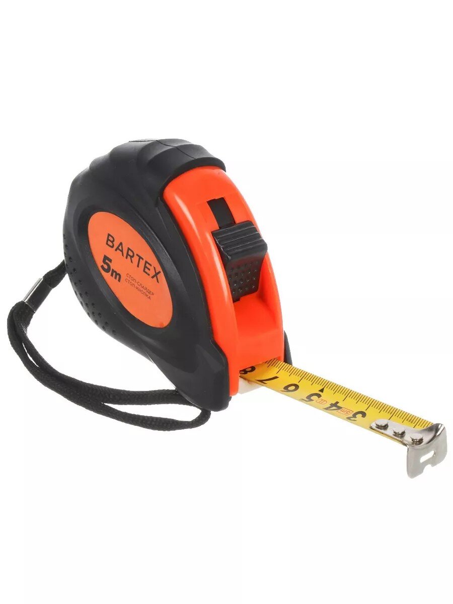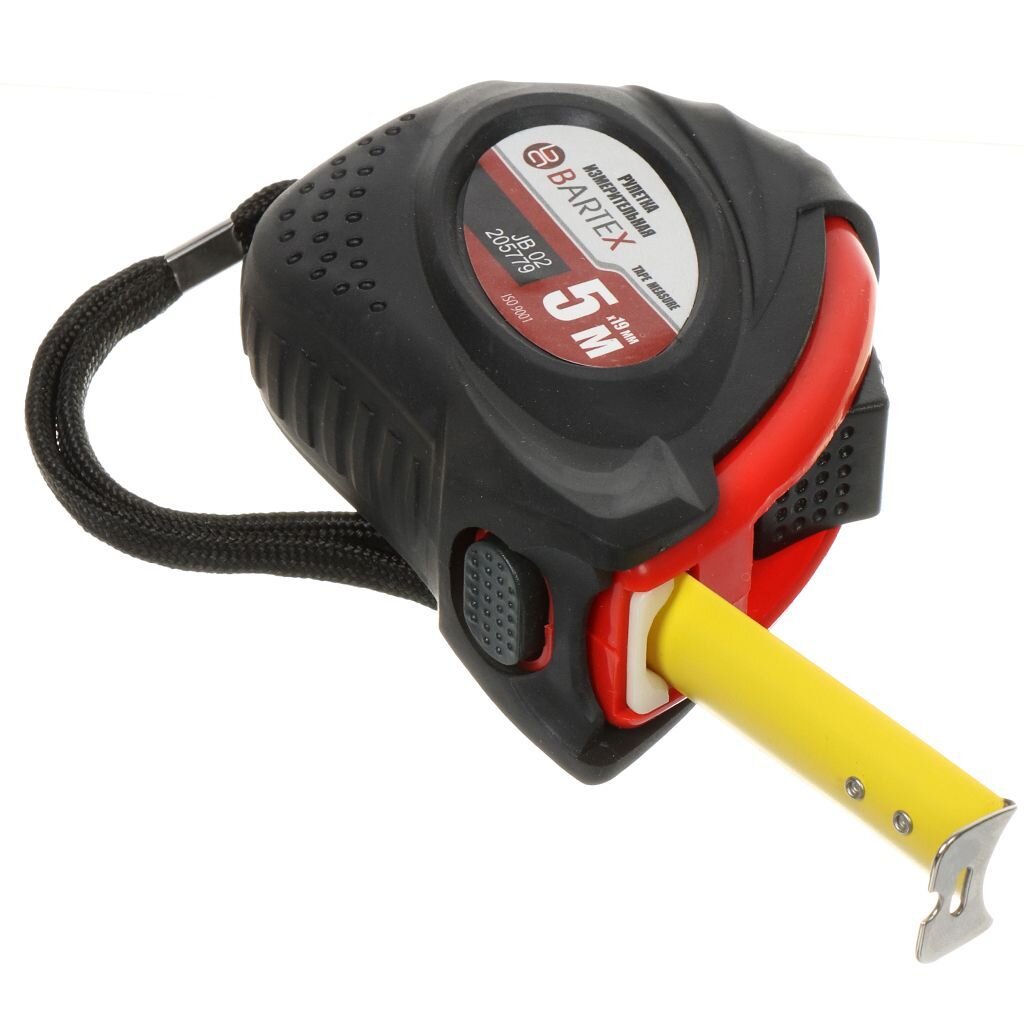 Рулетка измерительная Bartex JB-02 имеет обрезиненный корпус из ABS-пластика, который известен своей ударопрочностью, эластичностью, а также устойчивостью к кислотам, щелочам, маслам и воздействию тепла. Измерительная лента произведена из углеродистой стали с покрытием желтого цвета. Края ленты специально обточены во избежание случайных порезов при использовании.