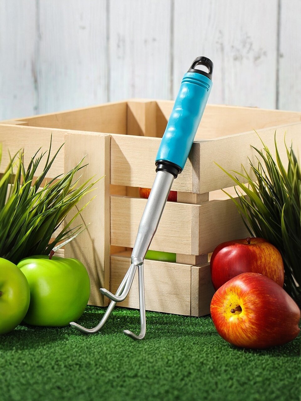 Главное отличие — прочные стальные зубья, которые не деформируются при работе с тяжёлой почвой. Пластиковый черенок облегчает инструмент и повышает комфорт использования.