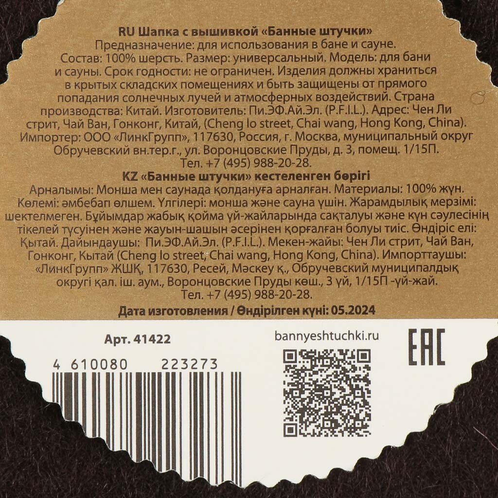 Изделие выполнено из плотного 100% войлока, цвет — коричневый, бренд — «Банные штучки», страна производства — Китай. Подходит для взрослых, не деформируется при стирке.