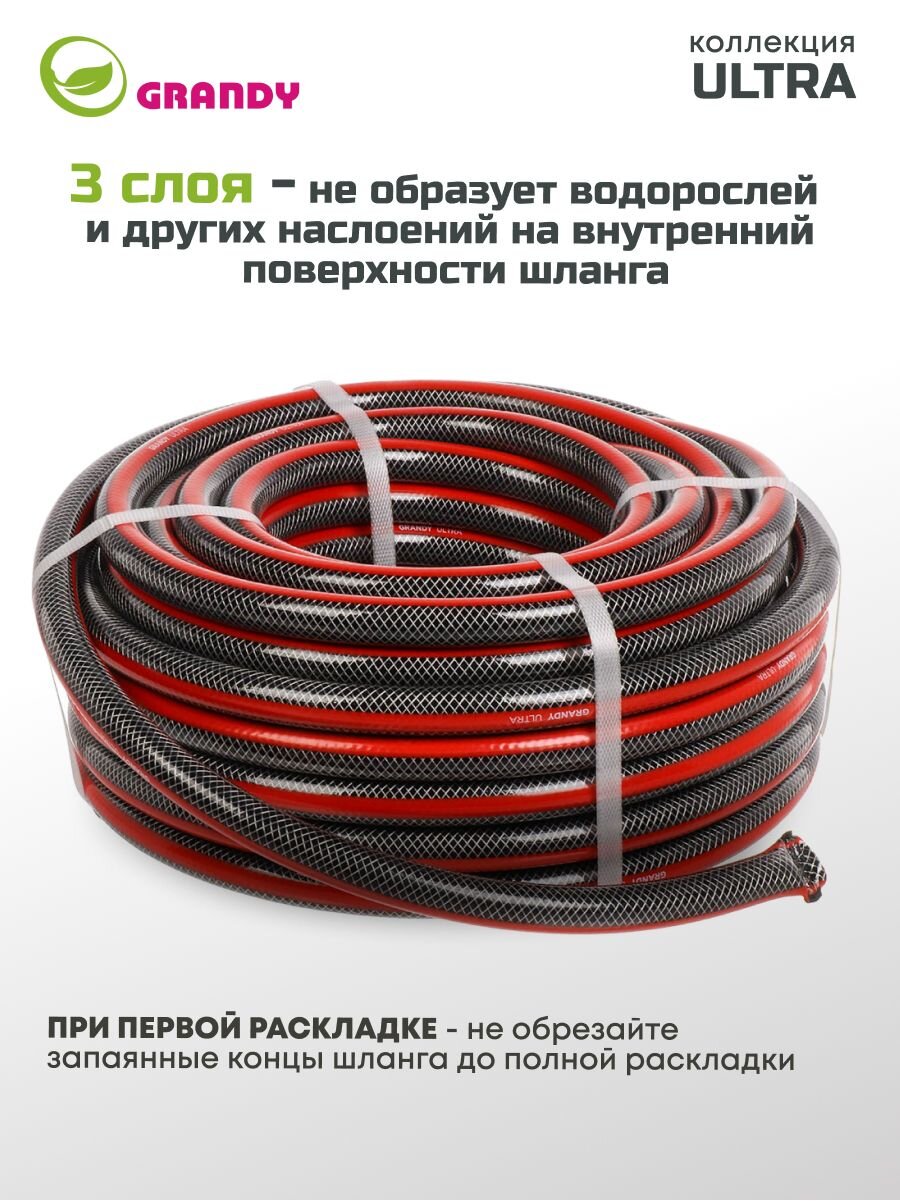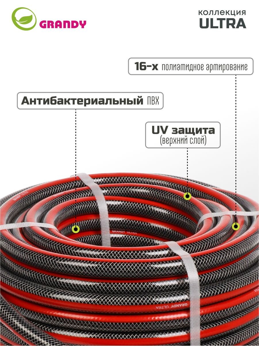 Шланг поливочный армированный Grandy Ultra не подвержен локальным вздутиям, не образует трещин и изломов. Проверен на герметичность, концы шланга запаяны под давлением. Шланг соответствует стандарту ISO 9001. Устойчив к прямым солнечным лучам и ультрафиолетовому излучению. Устойчив к коррозии и истиранию, не токсичен и не содержит солей кадмия. Не образует водорослей и других наслоений на внутренних поверхностях шланга. Три слоя.