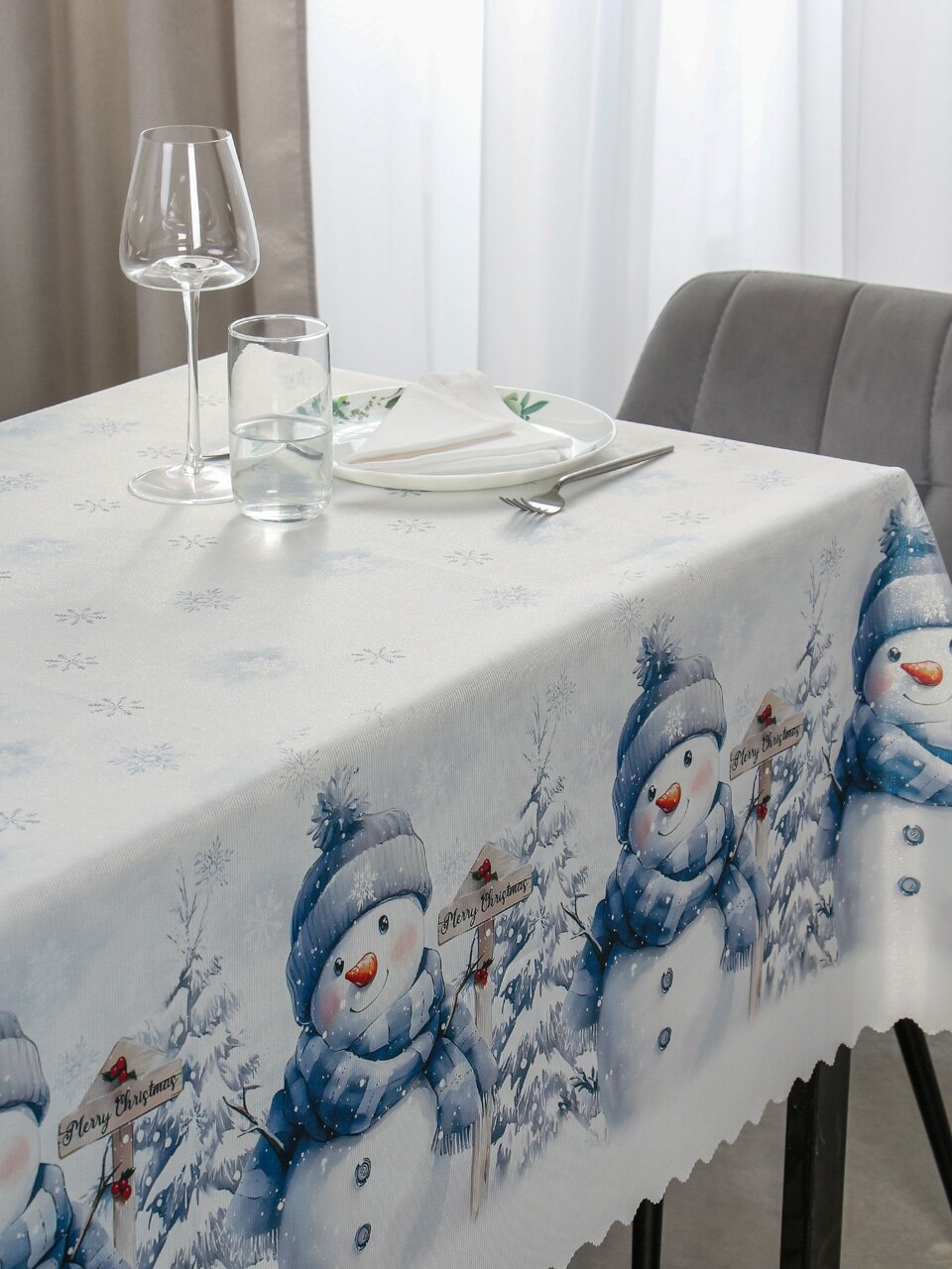 Скатерть 150х180 см с новогодним снеговиком: создайте праздничную атмосферу за 1 минуту, защищая стол от пятен и влаги — идеальный выбор для дома и подарка.