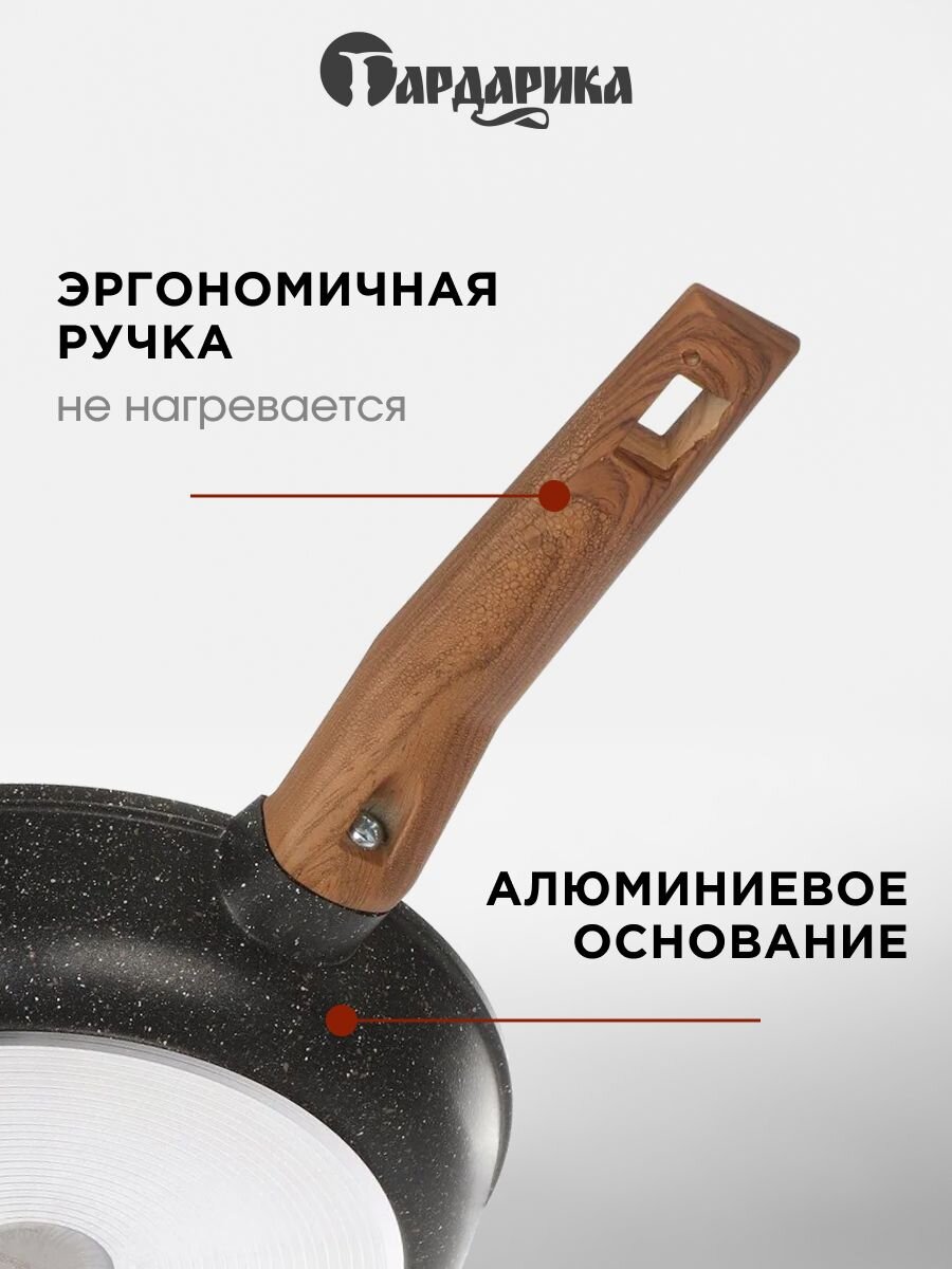 Сковорода из литого алюминия 24 см Гардарика Мегалит 18: долговечное антипригарное покрытие, эргономика soft-touch, идеальна для дома и дачи.