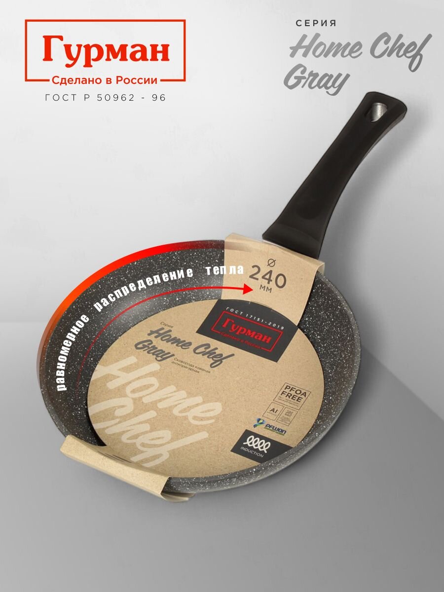 Если вы ищете, какую сковороду выбрать для индукционной плиты или как выбрать сковороду для универсального использования, обратите внимание на модель Гурман HomeChef Gray. Лёгкий алюминий обеспечивает быстрый и равномерный нагрев, а антипригарное покрытие PFLUON позволяет готовить без масла и легко мыть посуду даже в посудомоечной машине. Сковорода диаметром 24 см оптимальна для семьи из 2-4 человек и подходит для жарки мяса, рыбы, оладий, яичницы и омлетов.