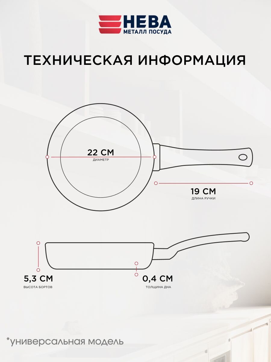 Диаметр 22 см (16 см по дну), высота борта 53 мм — оптимально для приготовления блюд на 2-3 порции, удобно для завтраков и ужинов.
