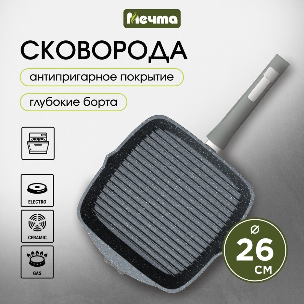 Сковорода-гриль Мечта Гранит 26 см: идеальный выбор для сочного мяса и рыбы без масла. Толстое дно 6 мм, антипригарное гранитное покрытие, 5 лет гарантии.
