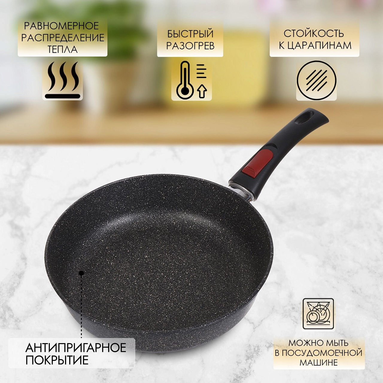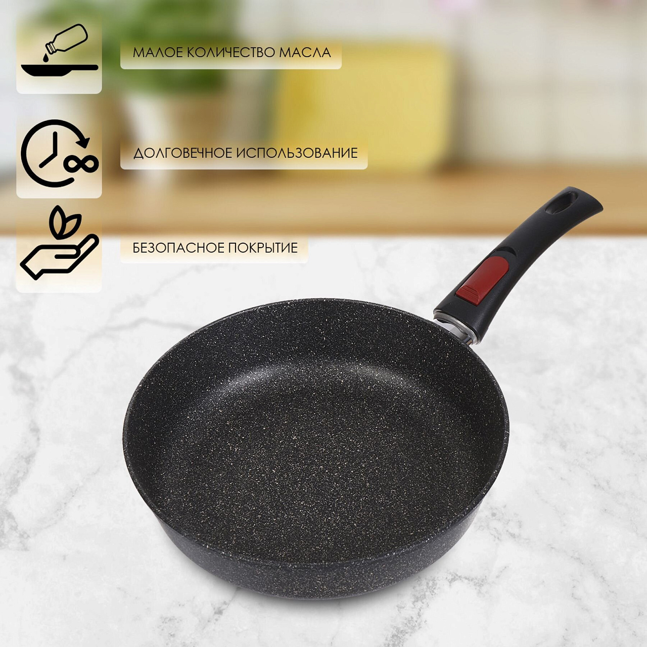 Сковорода 26 см из литого алюминия с антипригарным гранитным покрытием и съемной ручкой — идеальное решение для индукционных плит и универсального использования дома и на даче.
