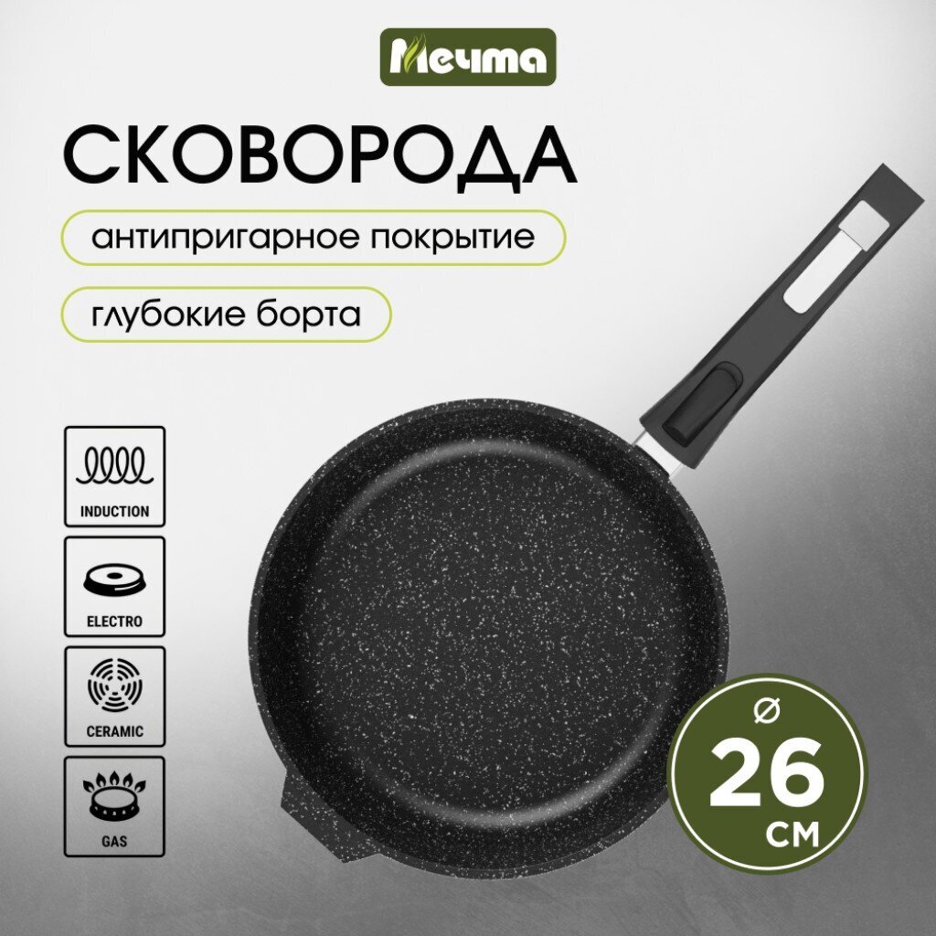 Сковорода литой алюминий 26 см Мечта Гранит black Induction Pro: антипригарное покрытие, съемная ручка, подходит для индукции — удобно для дома и дачи.