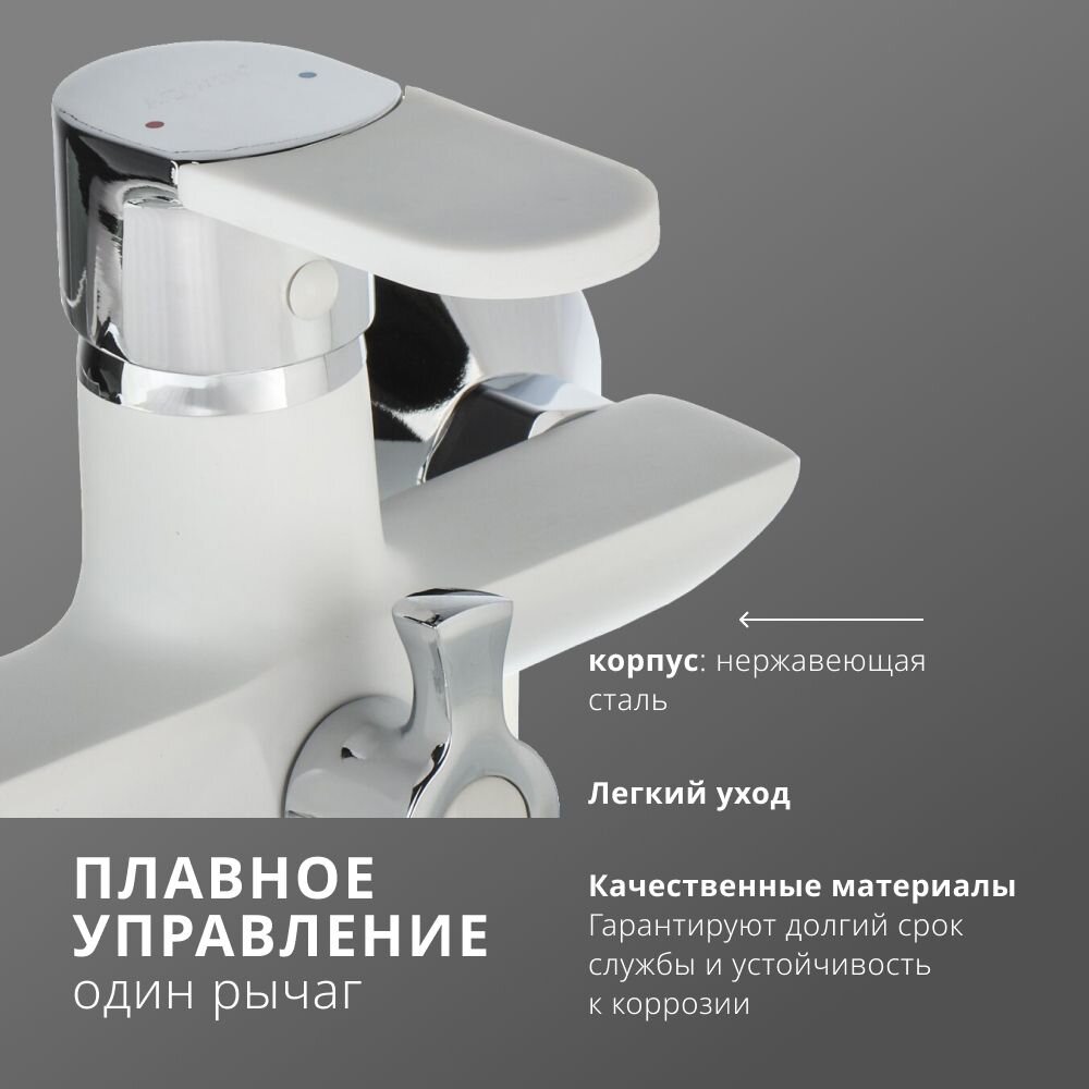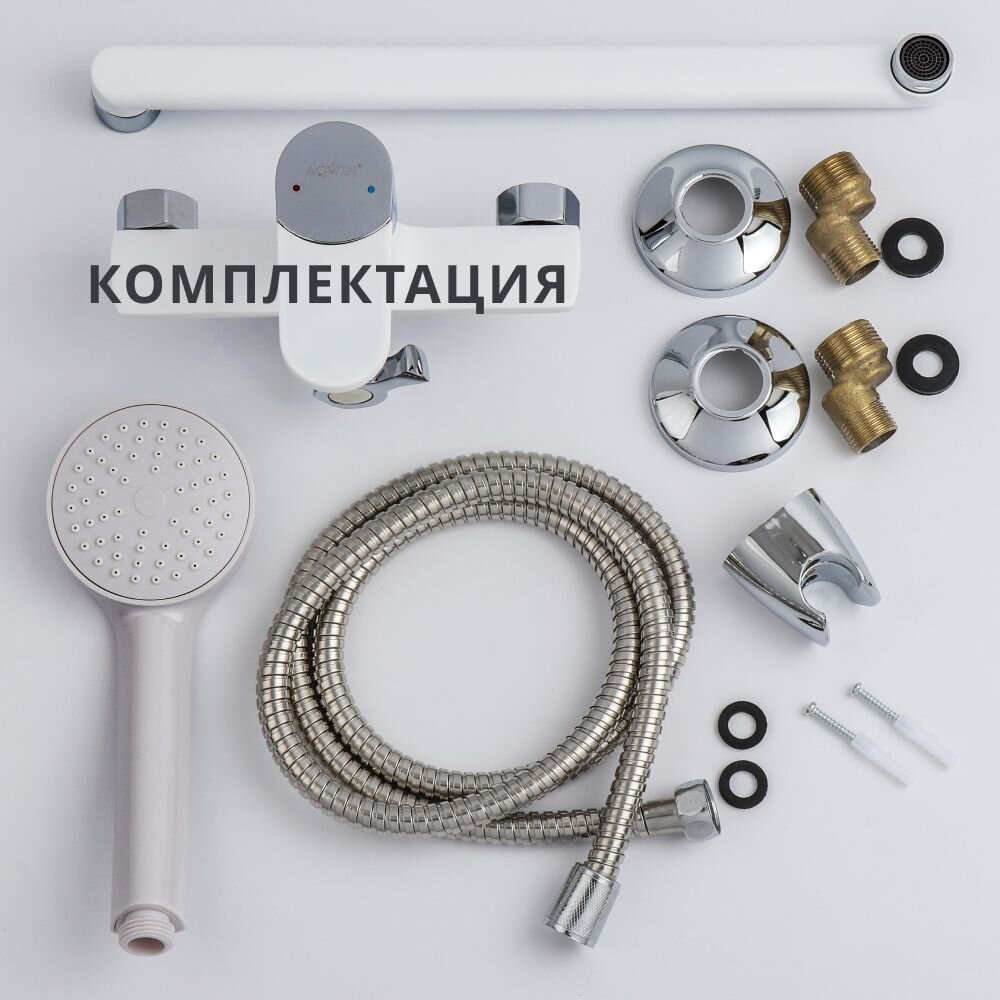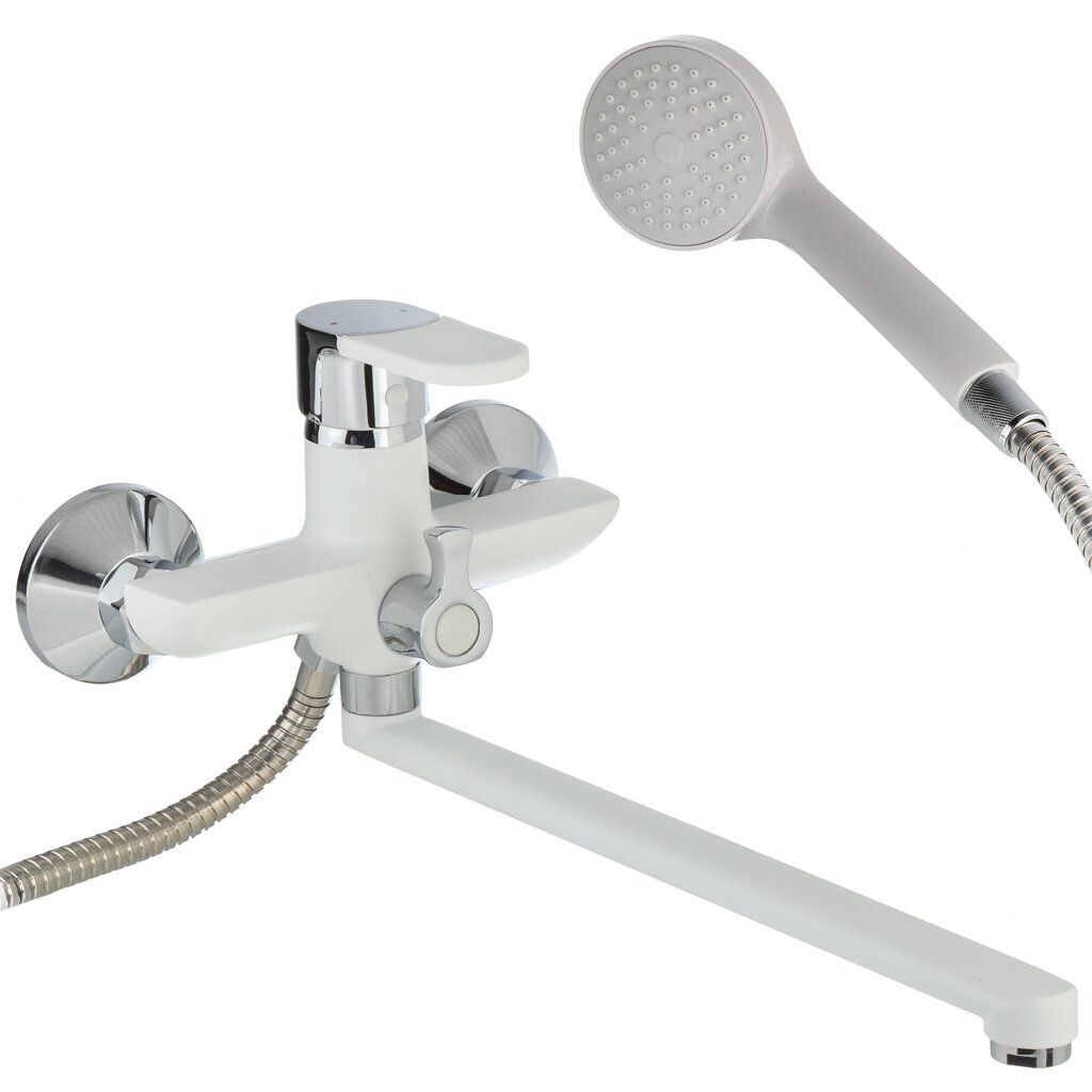 Смеситель для ванны Aqwin A22223-7: белый дизайн, керамический картридж, длинный поворотный излив 35 см — практичное решение для современной ванной.