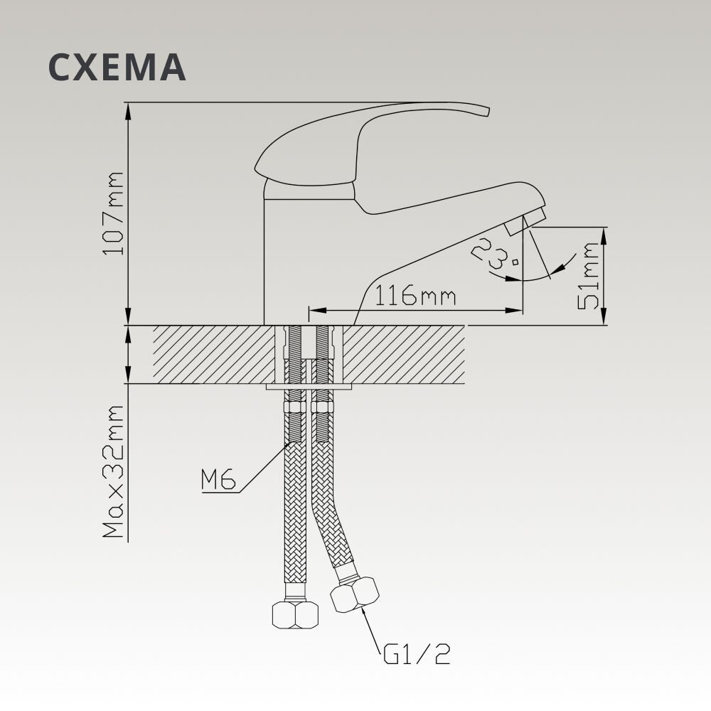 Диаметр монтажного отверстия составляет 35 мм, стандартное крепление гайкой обеспечивает надежную фиксацию на раковине.