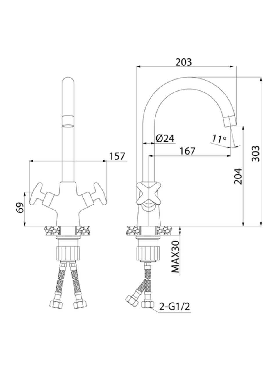 - Корпус из латуни, глянцевое хром-покрытие, средний излив (16,7 см), высота 20,4 см — идеален для большинства кухонных моек.