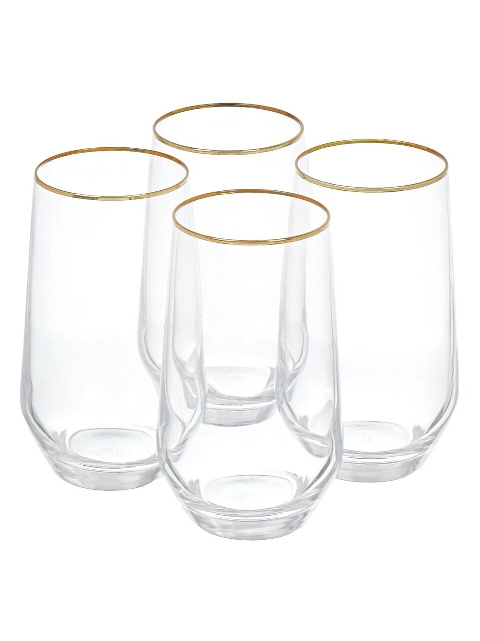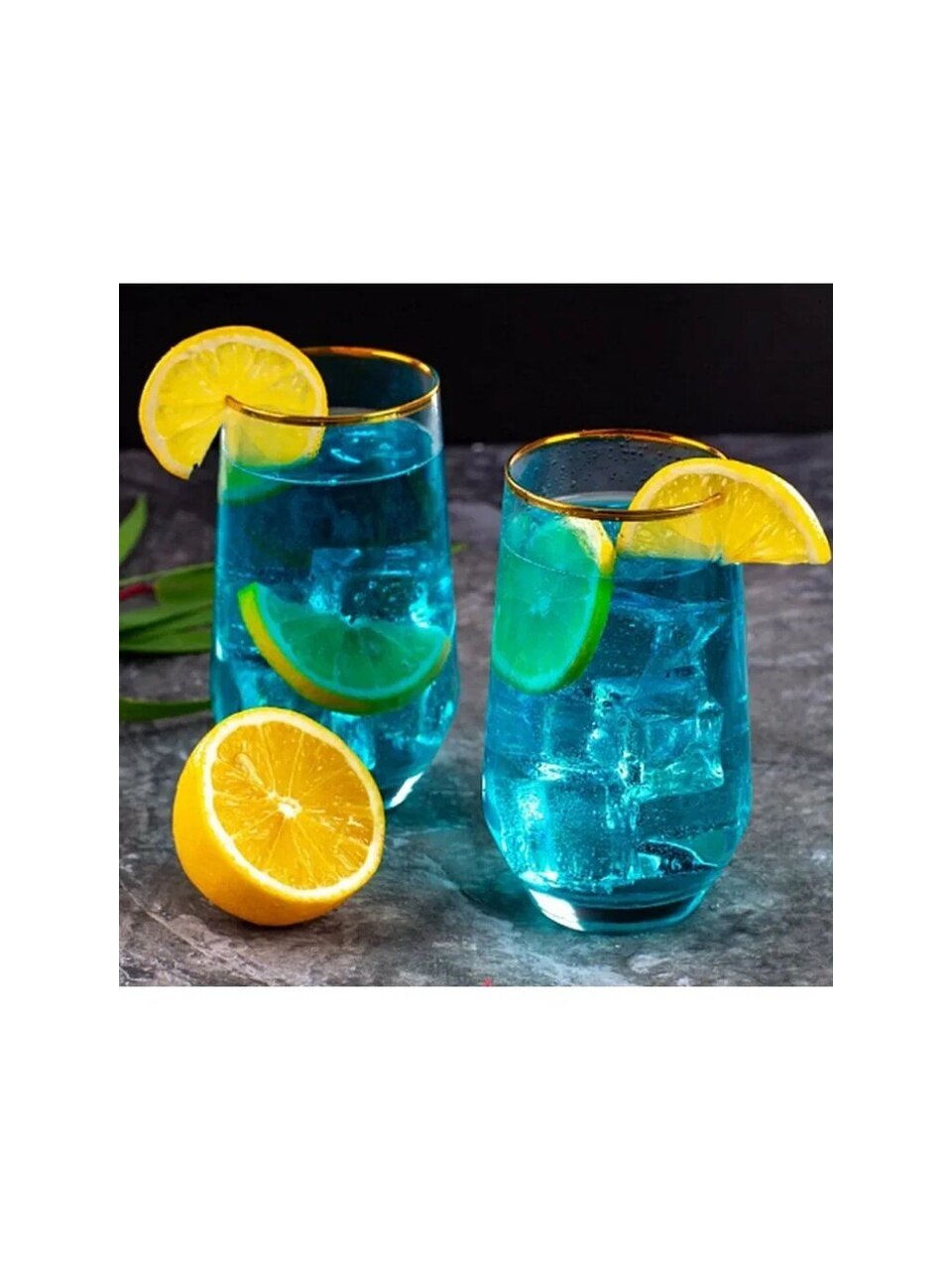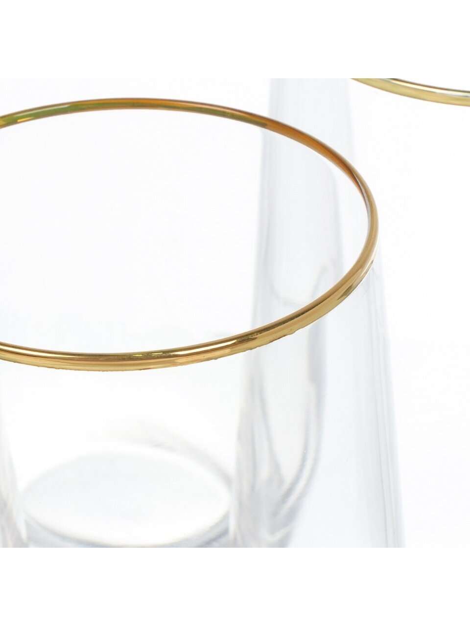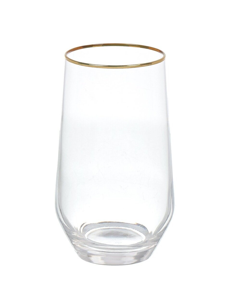 Каждый стакан рассчитан на 400 мл, выполнен из прочного прозрачного стекла, имеет классическую высокую форму «коллинз» и золотую окантовку.