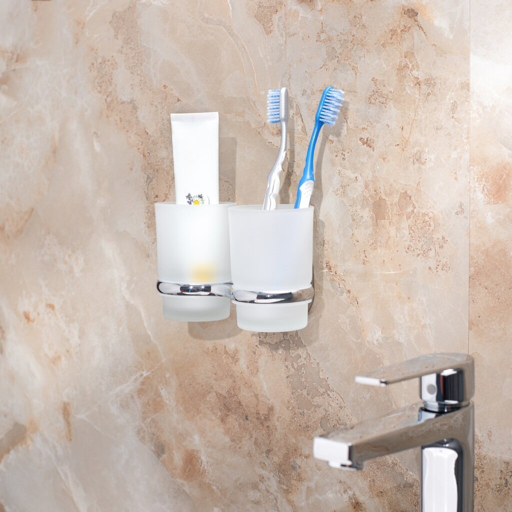 Аксессуар для ванной комнаты. Монтаж держателя производится на стену или иную твердую поверхность. Отлично подходит большинству дизайнерских решений. Стакан можно использовать как для зубной пасты и щеток, так и для прочих принадлежностей: бритвенных станков, кистей для макияжа, косметики.