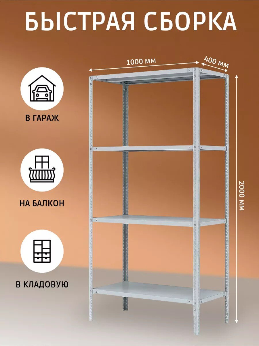 - Комплектация: 4 стойки 2000 мм, 4 полки 400х1000 мм, крепеж, пластиковые подпятники.