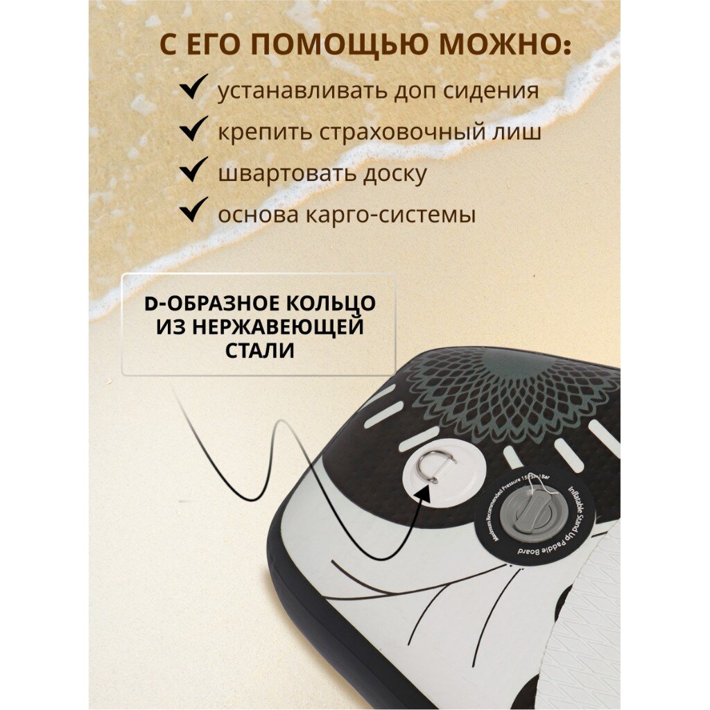 - D-образные кольца из нержавеющей стали (D 3 мм, D 4 мм). Это важный элемент, увеличивающий комфорт использования и функционал САП-борда. Кольца позволяют устанавливать специальные САП сиденья, крепить страховочный лиш, они же являются основой для карго системы, а также кольцо на носовой части позволяет швартовать доску или подвешивать её для высушивания.