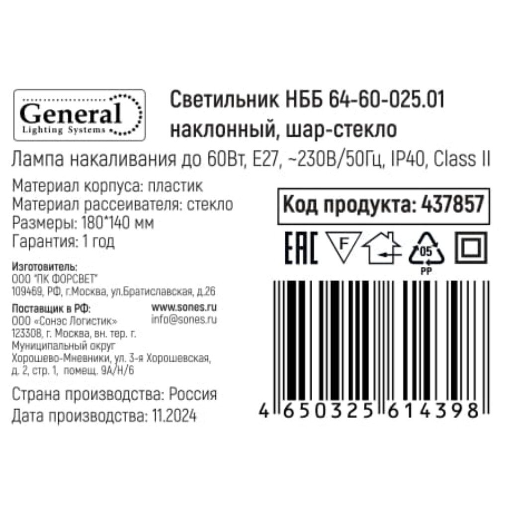 Светильник General НББ 64-60-025.01: универсальное решение для дома и производства — стеклянный шар, надёжный пластик, гарантия 12 мес.