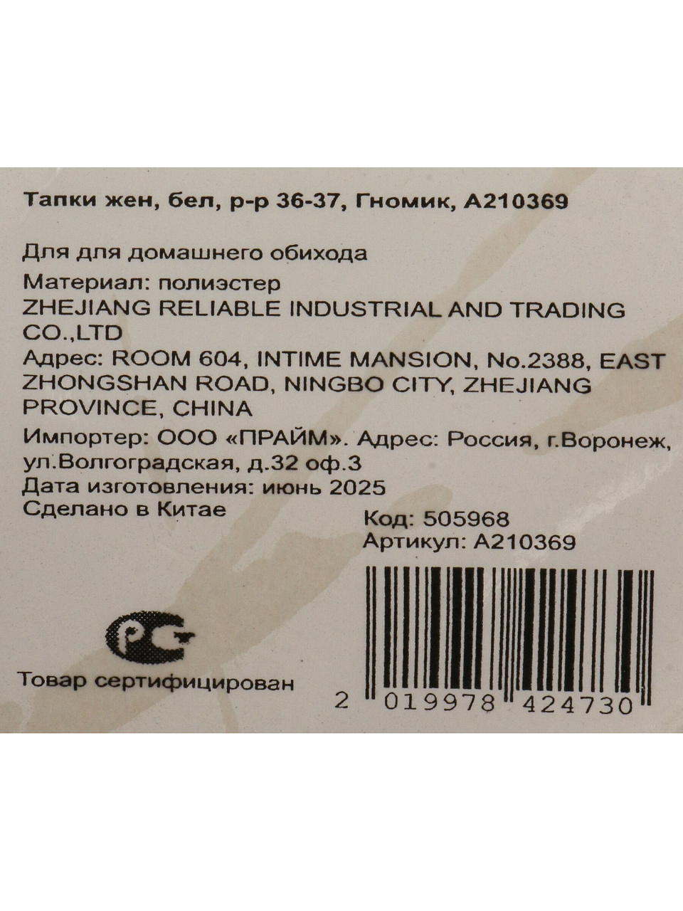Тапки жен, бел, р-р 36-37, Гномик, A210369