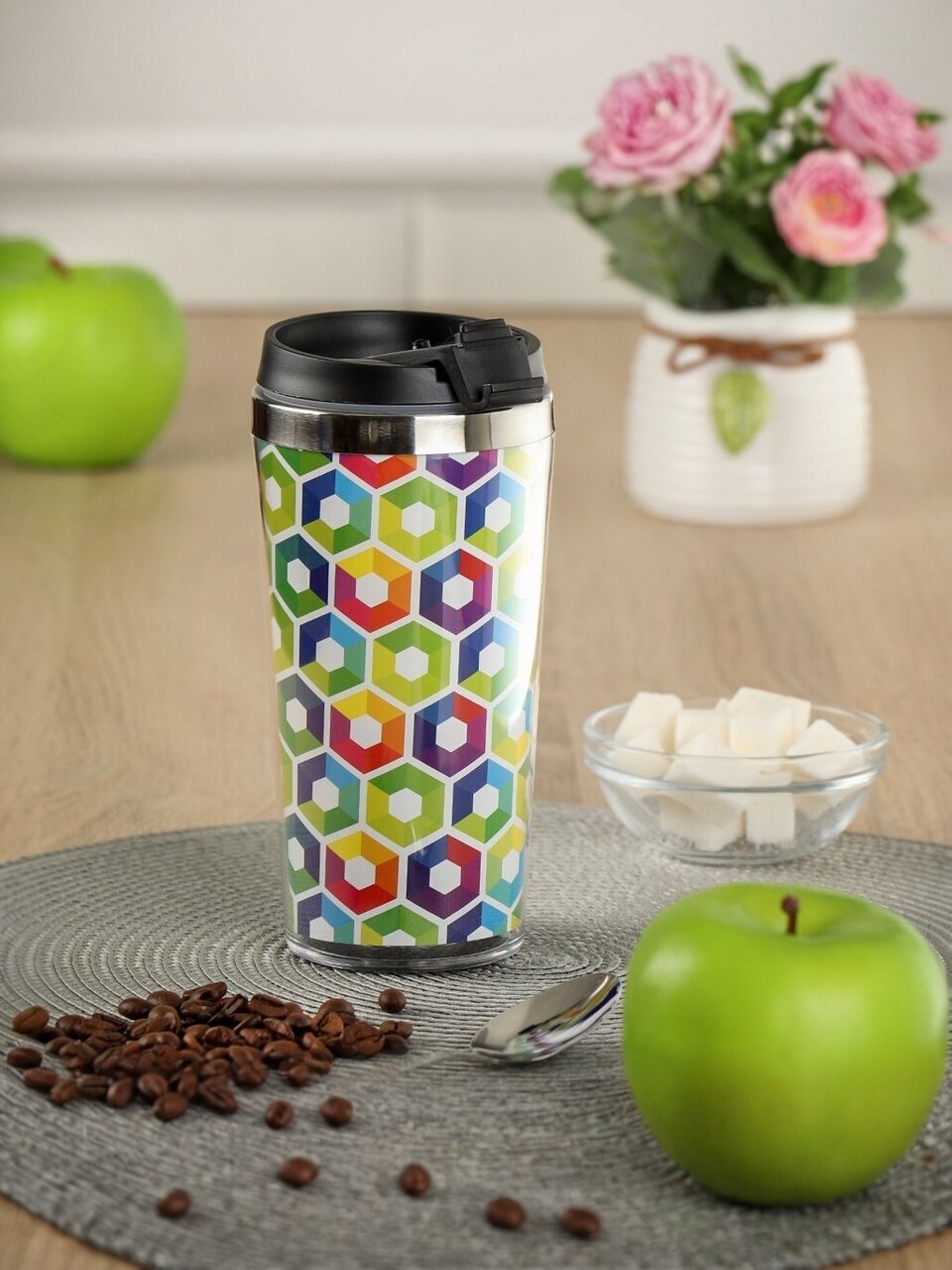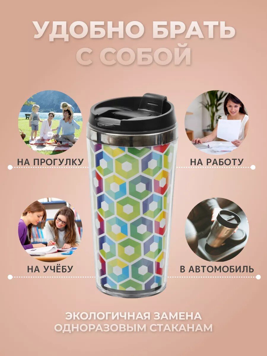 - Стильная термокружка с рисунком и широкой горловиной — удобно наливать и мыть.