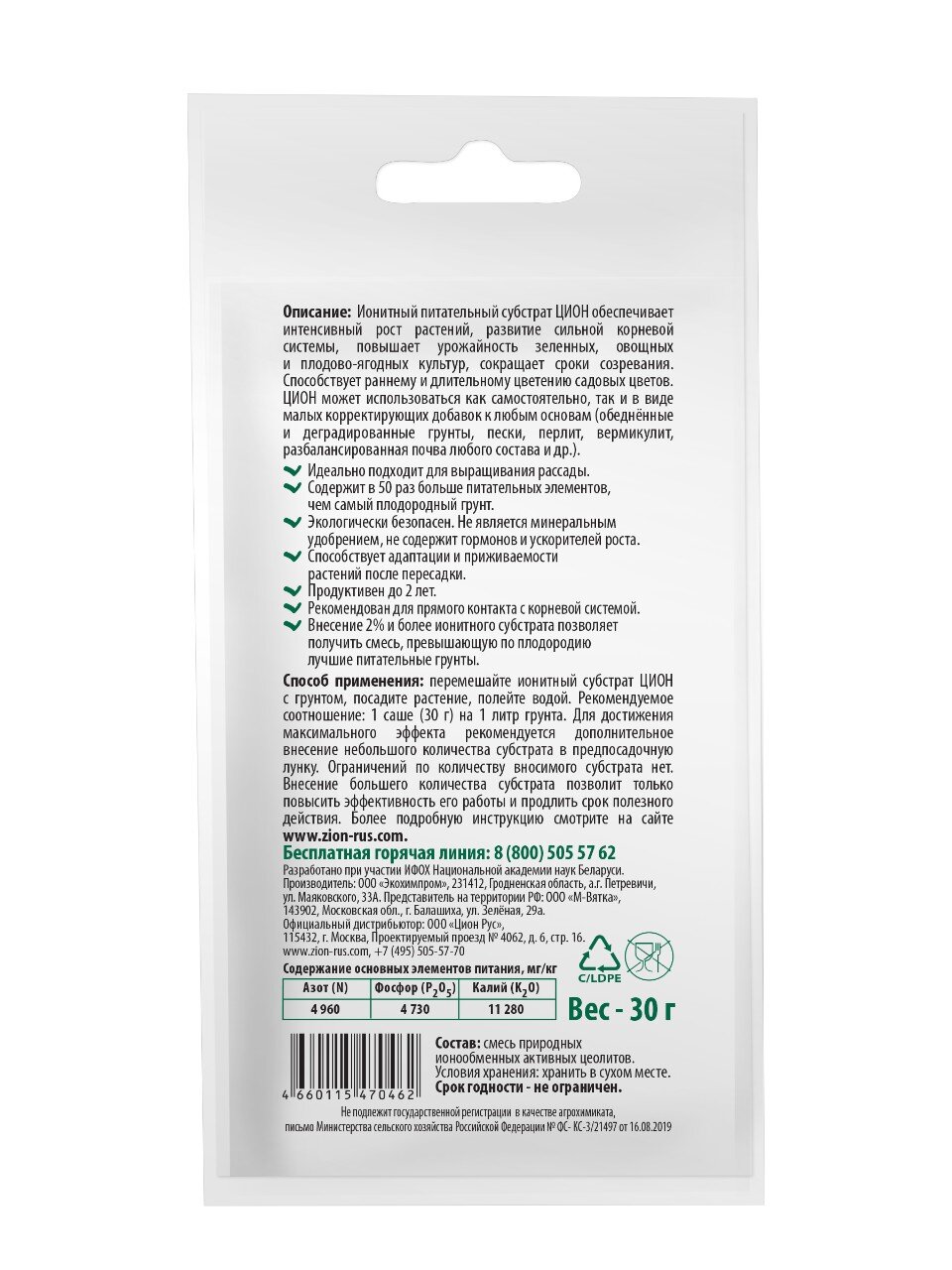 Ионитный субстрат ЦИОН УНИВЕРСАЛЬНЫЙ может быть использован для обеспечения растения сбалансированным набором элементов питания на любом этапе его жизненного цикла. В течение периода полезного действия ЦИОНа никаких дополнительных подкормок растению не потребуется.